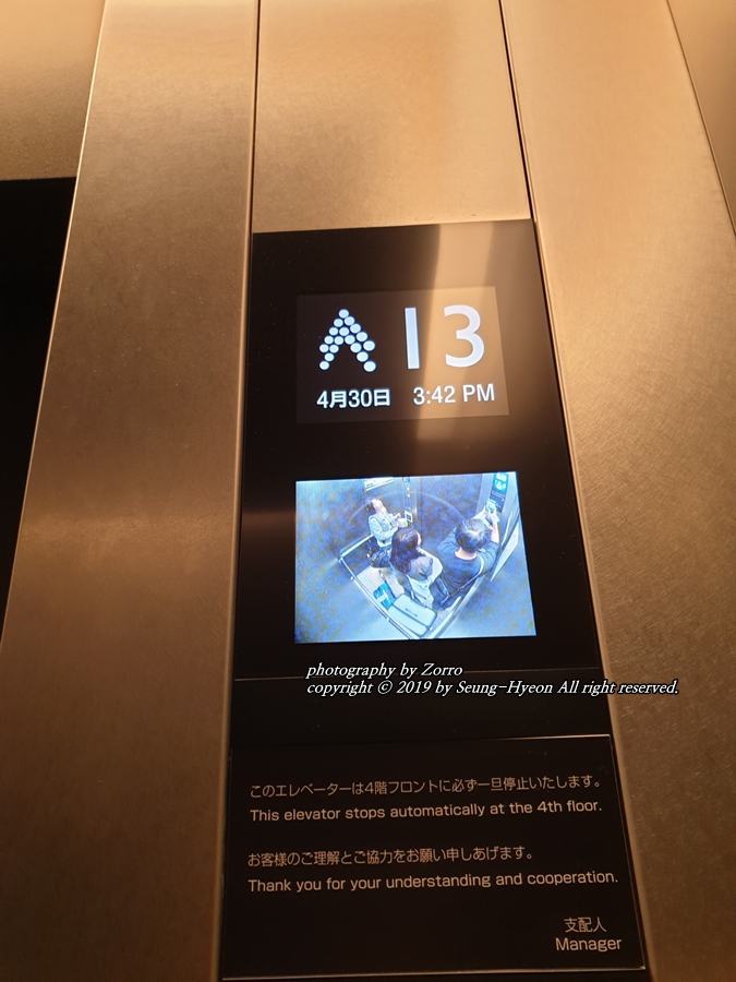 다양한 정보들이 엘레베이터 안에 있으며 해당 객실로 가기 위해서는 카드를 터치바에 된 후 해당층으로 올라가는 방식입니다.