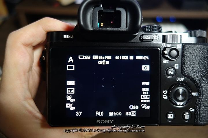 저의 미러리스 카메라 A7에 조심스레 넣어봅니다.