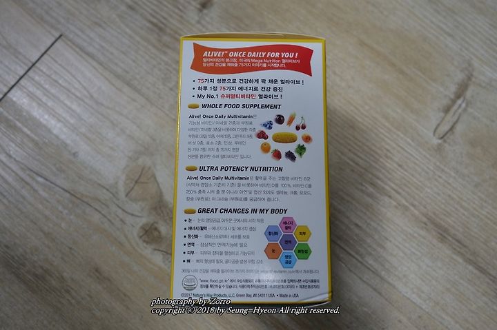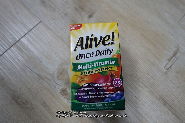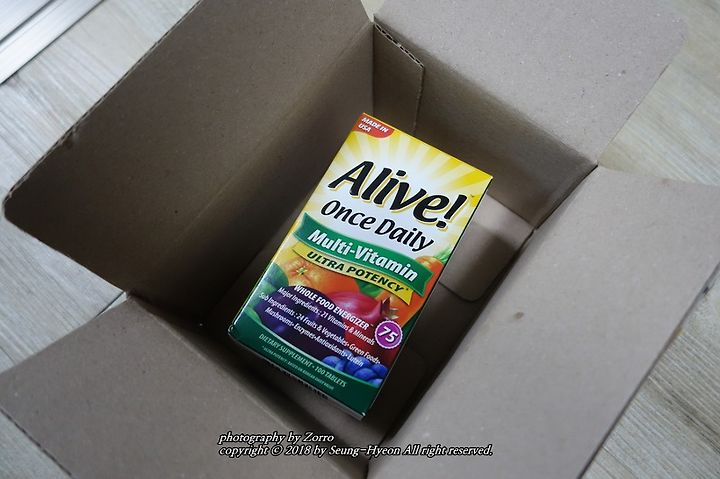 얼라이브 원스데일리도 마찬가지입니다. 부모님께서 종종 비타민을 챙겨먹으라 말씀하셨지만 그때에는 그냥 한쪽귀로 흘렸습니다. 하지만 지금은 다르지요. 알아서 구매해 챙겨먹습니다.