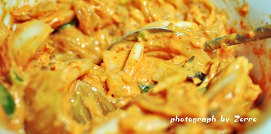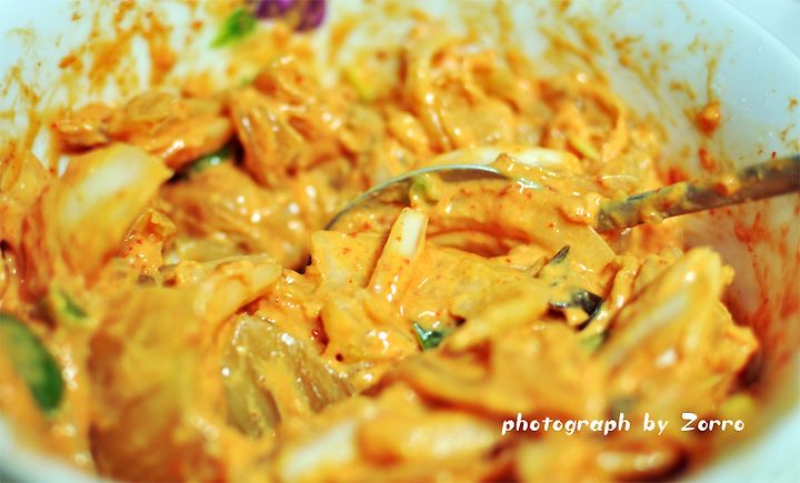 양파를 채 썰어 함께 넣어주시면 양파의 단맛이 김치 특유의 신맛을 감소시켜주는 역할을 한답니다^^