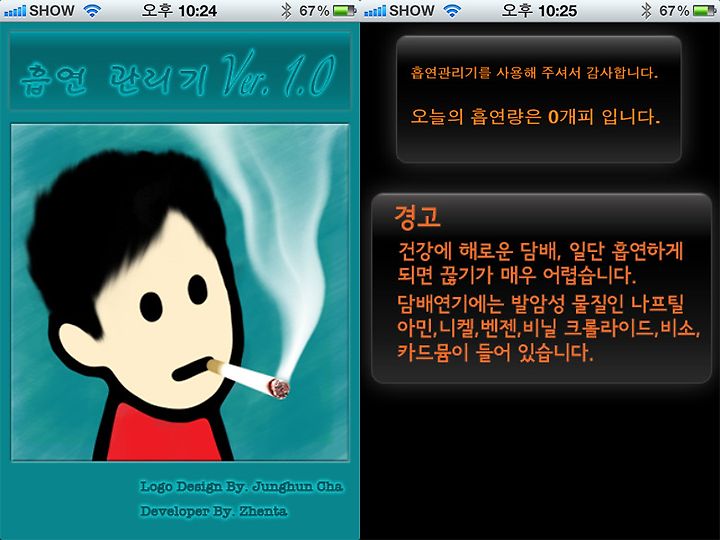 "흡연관리기" 어플을 실행 하였을때의 모습입니다. 경고문구.. 익숙하시죠?ㅎㅎ