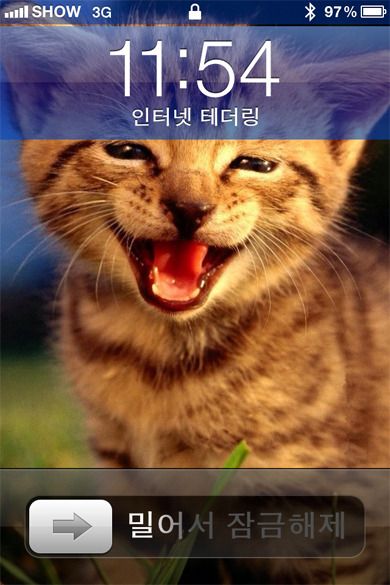 인터넷 테더링이 시작되면 아이폰의 화면이 위의 화면처럼 파란색으로 변하면서 연결이 되었음을 알려준답니다~