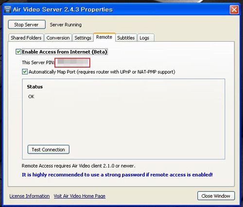 'Enable Access from Internet'를 선택한 후 PIN코드를 기록해두도록 합니다.