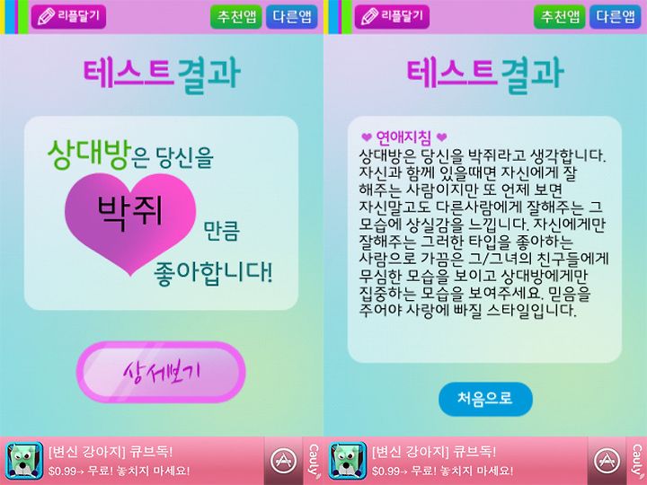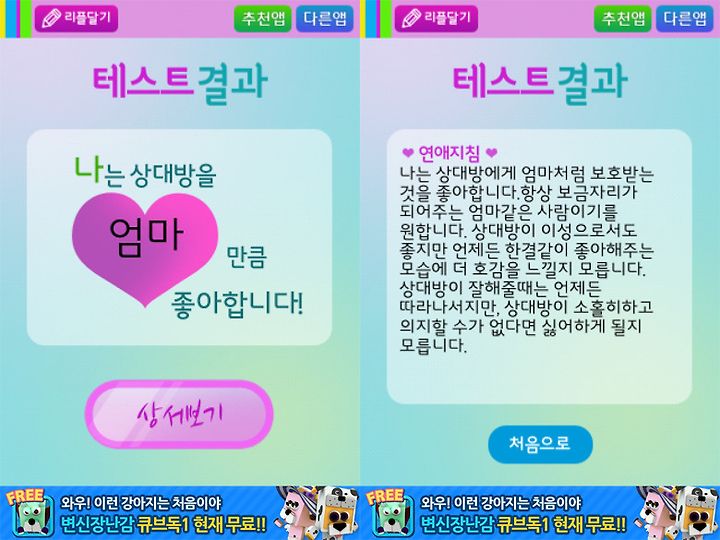 역시 임의적으로 선택해본 결과 엄마만큼 상대방을 좋아한다네요. 개발자에 의하면 20가지의 결과중에