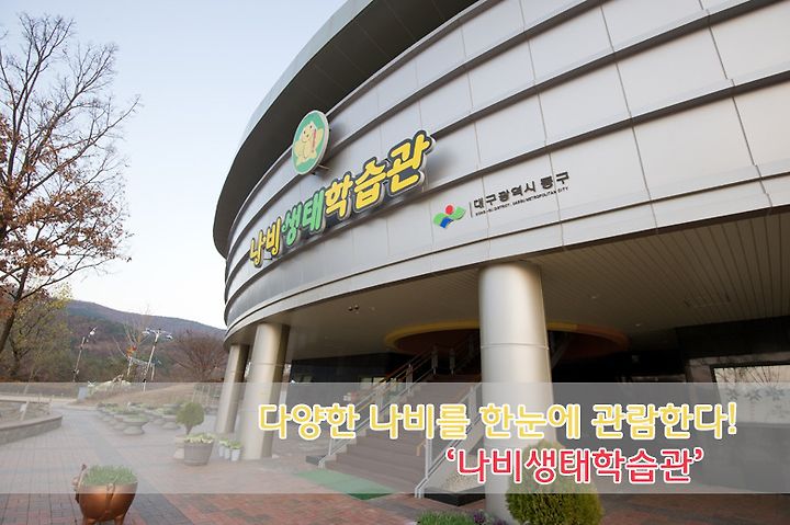 '나비생태학습관' 은 대구 동구의 봉무공원에 위치하고 있습니다. 이곳에는 나비생태학습관 뿐만 아니라 다양한 여가활동을 위한 봉무레포츠공원, 어린이 놀이시설물, 등산로등이 있어 지역민이나 방문객들에게 좋은 휴식공간을 제공해주고 있습니다. 특히 오늘 소개해드리는 '나비생태학습관' 에는 우리나라 나비 150여종과 외국나비 100여종등 총 1000여마리의 표본들이 전시되어 있기에 다양한 나비들을 보실수가 있습니다. 테마별 구성으로 다양한 방법들로 접근할 수 있기에 나비에 대해 알고 싶거나 관심이 있는분들이라면 꼭 한번 다녀오시기 바랍니다.