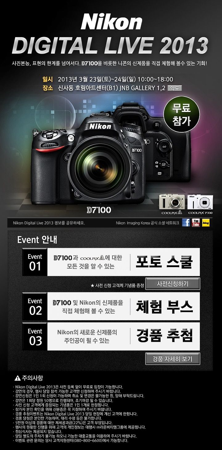 저는 D600을 신청해볼까 하는데.. 지난번 D5200이 되고 난 직후라 과연 연속해서 될 수 있을런지는 잘 모르겠네요. 그리고 체험단 행사 이외에도 이번달 23일과 24일에는 니콘 디지털 LIVE라고 해서 니콘의 신제품을 직접 체험해볼 수 있는 기회도 마련되니까요. 주위에 계시거나 관심있으신분들은 참가해보시기 바랍니다. 무료참가니까 부담없이 말이죠 ㅎㅎ
