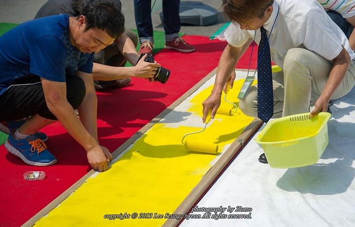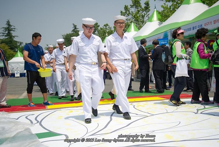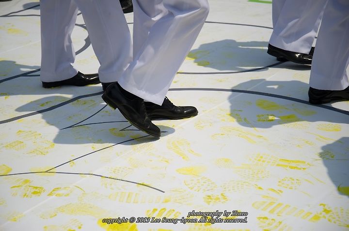 하얀 제복의 멋진 군인들과 천진난만한 아이들의 발자국 남기기, 그리고 남녀노소를 불문하고 계속 진행된 환경 발자국 남기기로 노란색 에코플라워프린팅은 시간이 지날수록 그 모습을 찾아갔답니다.