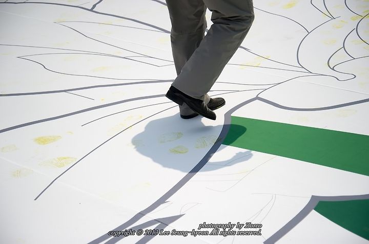그리고 바로 앞에서 진행된 에코 플라워 프린팅, 즉 환경의날 기념 환경 발자국 만들기 행사였는데요. 앞에서 환경 사랑을 서약하고 참가자들이 직접 걸어서 환경발자국을 남기는 것이었습니다.